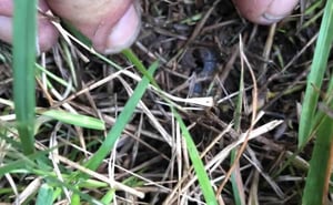 Adult Spittlebugs are usually black, with two orange stripes down their back. They can jump high, and homeowners often notice them when outside mowing the lawn or performing yard work. They are most problematic when they are in the nymph stage of development and are more difficult to locate during this time. If you look closely at your grass, you may find the sacs that they live in during its early stages of growth, which looks like a large mass of small bubbles.
