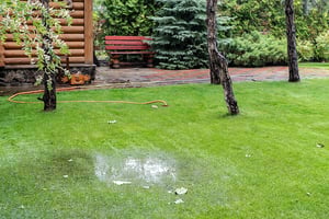 While drainage problems can be a frustrating issue for property owners, there are solutions available. First, it is important to pay attention to your watering schedule. If you are already struggling with flooded areas of your lawn, then your sprinkler system may be contributing to the problem. Next, check your downspouts. If they are too short, or are suffering from damage, then this can cause soil erosion where the water is making frequent contact with the ground beneath it. Repairing or extending your downspouts can help. If the problem persists, then you may need to install a swale, French drain or rain garden to better direct the flow of water.